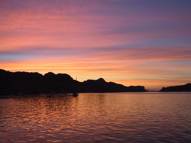 Got a reasonable breeze across and we sailed completely round the island to the north west side and dropped the hook in 32 feet of water. It was still quite hot at 5:30pm so we decided to clean some of the rest of the hull. The visibility was the best we've had for a while now, making the chore that much easier. We had a lovely sunset calm evening again until around 8:30 when suddenly the wind picked up to only about 10knots but straight from the south west, bringing with it an annoying little chop. Not the most comfortable anchorage but in these conditions we were safe enough. It is a very marginal anchorage though for anything stronger than 10knots of wind. There was also a current running through here which is only about 1.5knots at the moment. This could easily be a 3 to 4 knot current during more extreme tides, thus I doubt this anchorage is doable much of the year.