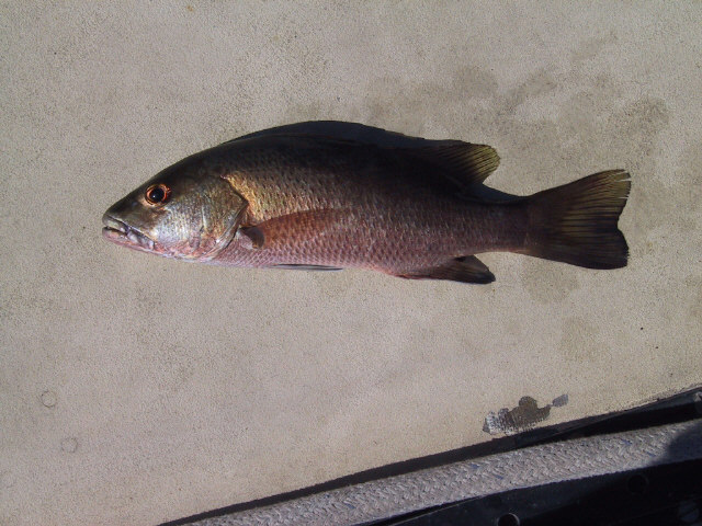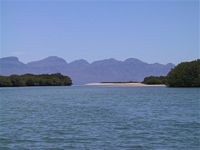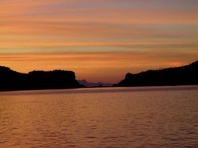 Michelle drove the dinghy, Robin worked the fishing rod and the camera. We trolled along the mangrove edge in the lagoon and success! We caught our first different type of fish since December. It was a small Pacific Dog Snapper (we think), perfect breakfast size. After trolling a few more times we caught another small one but Michelle took pity on him and tossed him back - he needed to grow up a bit. After tiring of fishing we landed the dink and explored the rocky breakwater for a wee bit, then found another exit on the beach side and ported the dinghy through it over 6 inches of rushing incoming tide and circumnavigated the entire spit back to Warrior. A couple of cocktails later taking in a perfect afernoon sunset, a lamb dinner cooked by Robin and a bottle of red wine, a perfectly serene anchorage, the white noise of thousands of little fish jumping all around, life is so tough. Ah yes it was too good to be true. Sandflies from the mangroves - jejenes or noseeums for you non-Aussies (we saw 'em, heard 'em, squashed 'em, repelled 'em and hid under the sheet from 'em - all unsuccessfully) - woke us up about 1am when the wind died and thus we endured a few tortuous hours till daylight.