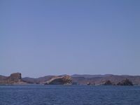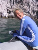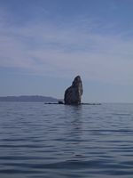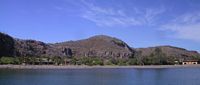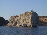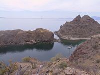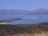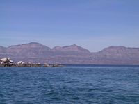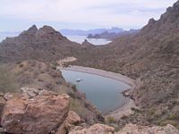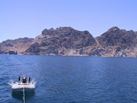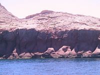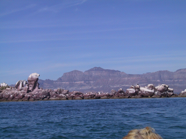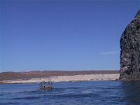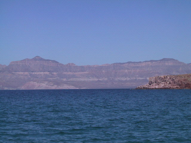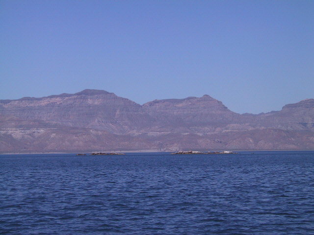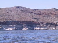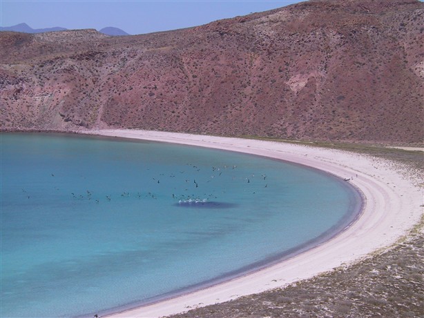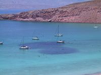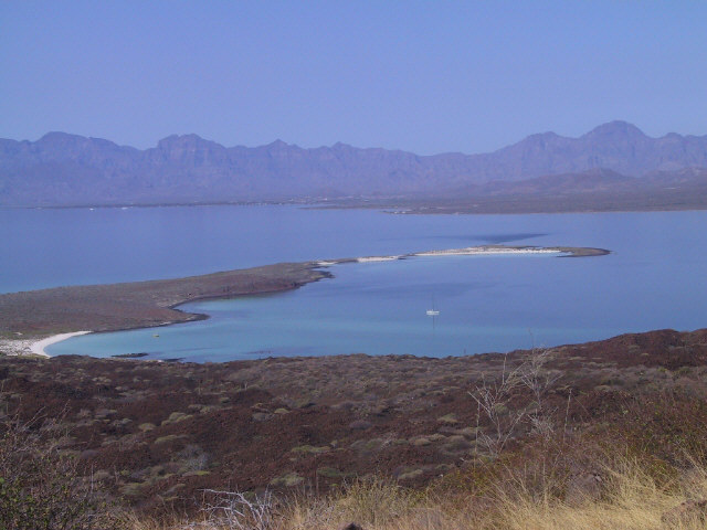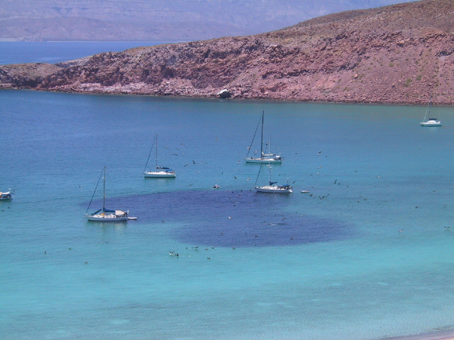 After lunch we headed ashore and found that Southern Bell had anchored while we had been dowm below. We thought they'd have been further up the Sea by now so were pleasantly surprised. George and us climbed the hill to the top and tried to take some decent photos of the area. It was a magnificient view with the stratified mountains of the Baja mainland as backdrop, the turquoise waters of the cove and the dark shape in the water being thousands of fish, all desperately trying not to be dinner for the couple of hundred pelicans and seagulls gorging themselves. Every 15 minutes or so an edge of the School would get too close to the surface and the wheeling pelicans would drop at the rate of 2 or 3 a second.