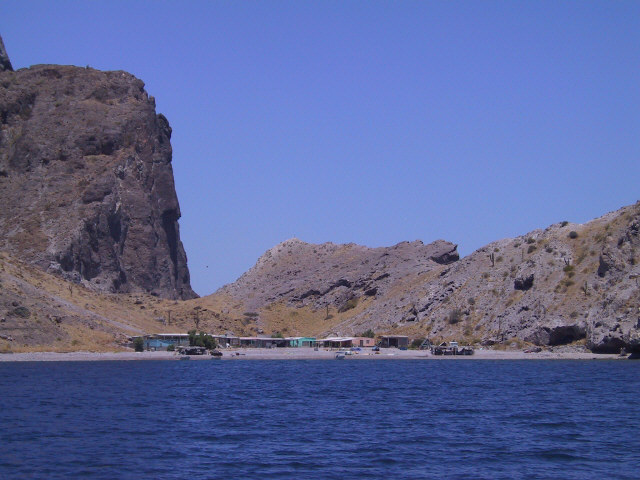 The snorkelling on the north tip was reported to be good and it didn't disappoint us. We saw substantial groups of fish, and at least 25 different varieties scattered over the rocky reef, along with a couple of forms of coral and starfish. We lasted about 30mins in the water even with the extra warmth from the lycra suit. It is still a bit too cool for us to really enjoy the water and we froze dinghying back to Warrior. Took a quick shower to rid ourselves of salt, upanchored and headed 7nm back to the Baja Mainland to San Evaristo Bay, a tiny bay with an even tinier village and a dirt track leading out of the mountains, it's only access to other parts of the penisula. Robin had sprayed the inside of the boat just before we went snorkelling, but a few jejenes survived and travelled with us most of the way.