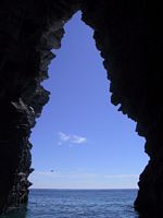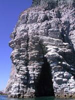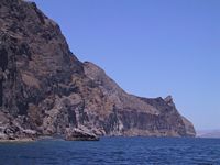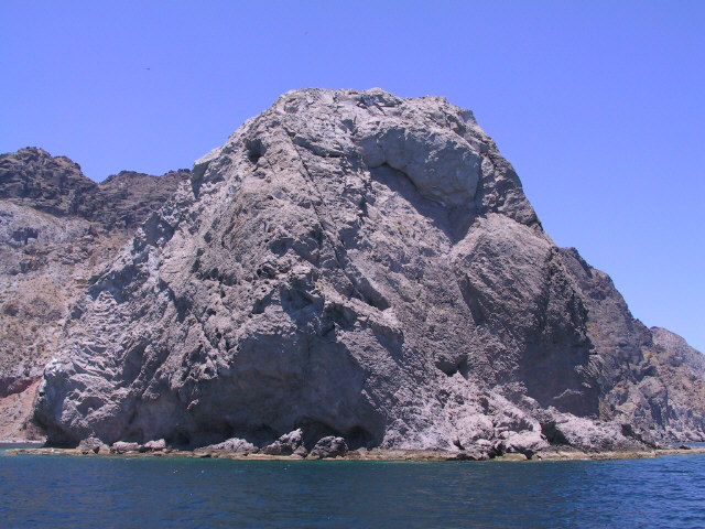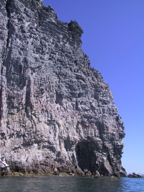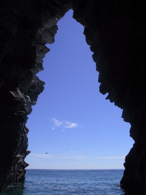 We got 2 good hours of wind before it died. We flopped around for another hour or so then decided to motor the rest of the way to Partida Cove, an ancient volcanic crater. We ducked in between Isla Bellena and the shore which was a nice diversion. The cliffs on entering Partida Cove look like some funky kind of chocolate blamange with burnt sugar icing on top. We got the boat anchored, ate some lunch, tidied up a bit while checking the boat wasn't going to go anywhere then tossed the dinghy in the water and headed out through the gap between the islands of Partida and Espiritu Santo, which is passable only by dinghy, and onto the Eastern side. Once there we turned right motored over huge boulders that had fallen from the cliffs above and explored some sea caves in the cliffs which were truly spectacular. It was mirror calm with no swell so we were able to dinghy into two large caves and went ashore in one.