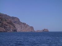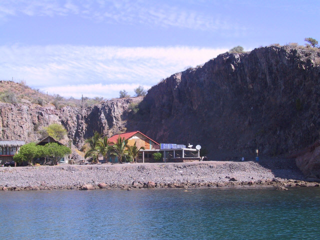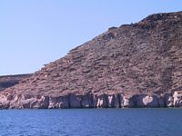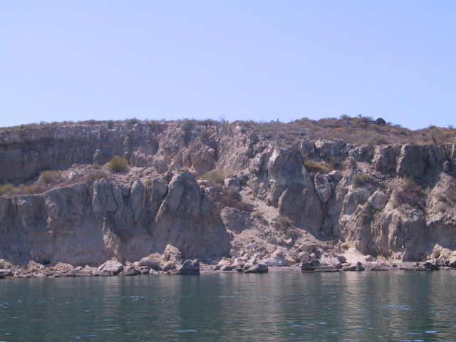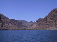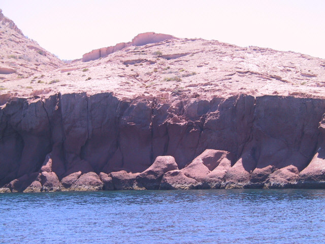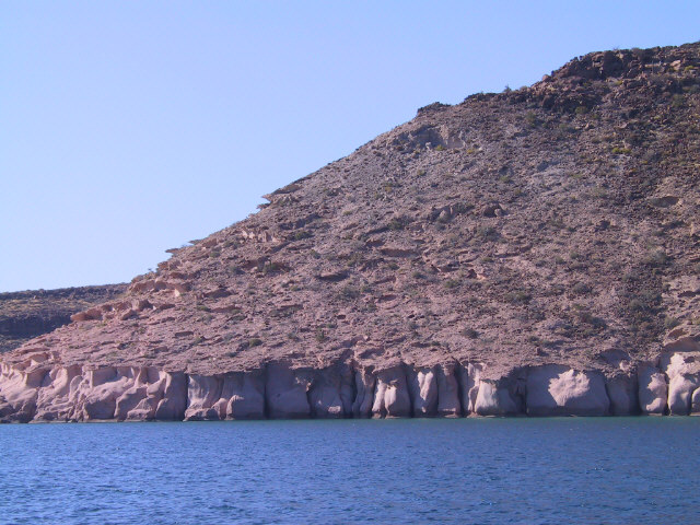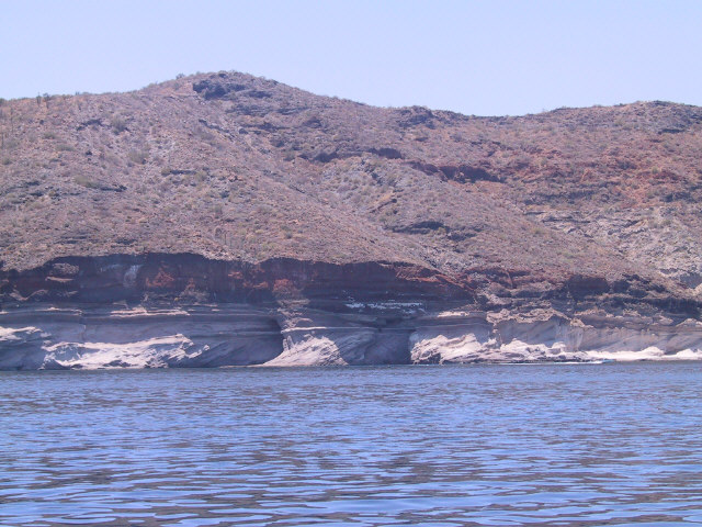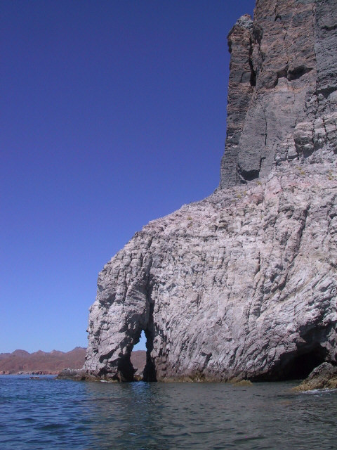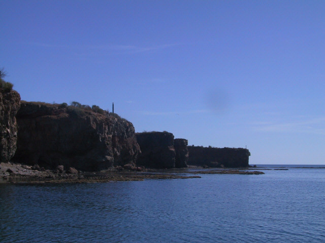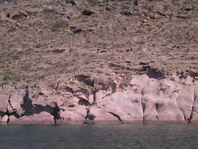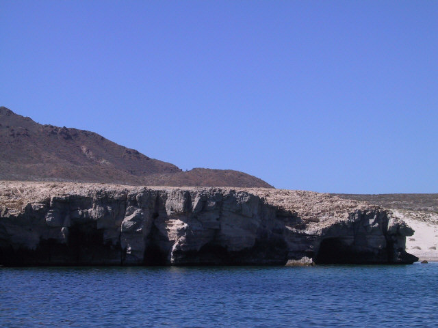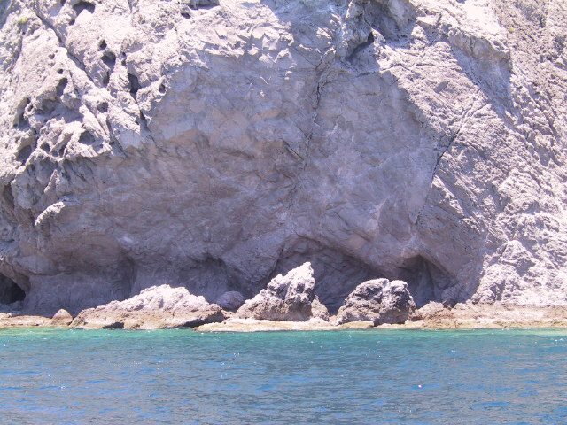 Today we decided to head further around Isla Carmen to V-Cove as it's fondly known. It was a pretty little cove and we had it to ourselves except for a couple of pangas camping out. One lot was asleep on the shore under a canvas shade, the other lot asleep in what seemed excruciating positions on the thwarts of their anchored panga. It seems these are guys who fish at night. The cliffs lining the cove were dotted with caves which we explored, and there was a pebbly sand beach at the head of the cove where the local fishermen had their day camp. After exploring the local caves we decided to dinghy around to the previous cove, Playa la Lancha and explore the area over there. Tao 8 was anchored over there and we stopped and yapped for a while and after exploring the cliff faces and more sea caves we headed on back to the boat. There didn't seem to be anywhere near the fish life that there had been on other reefs. Maybe it's northerly aspect and the fact it's totally unsheltered to the winter storms makes it a tougher environment for fish. Whatever the case it's far more barren than other places we've seen but the nearby cliff scenery was special.