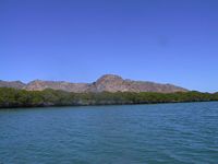 Dropped the hook in a beautiful turquoise shoal (whoops, forgot to get a picture of that), the water outside of it being quite deep. Michelle cooked chicken quesadillas for lunch then we jumped in the dinghy and headed over to yet another mangrove estuary. We took the fishing rod, a bucket and the camera but we weren't really expecting much different from other mangrove estuaries we'd seen. We were to be pleasantly surprised. The short river estuary emptied out into this wonderful lagoon on the other side of San Jose Island, the seaward edge of the lagoon being formed by a long narrow spit of gravelly rock, all that divided it from the ocean. The entire rock wall was a supurb feat of nature.
