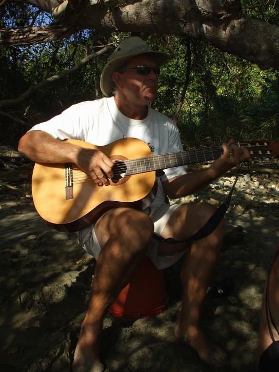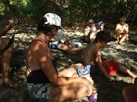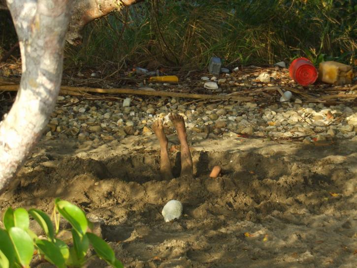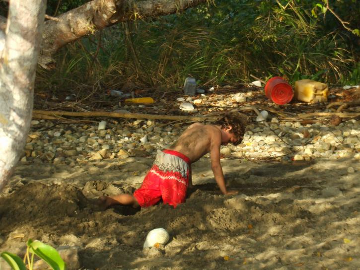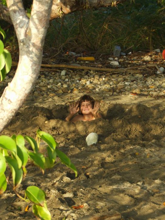 The party continued today with a BBQ and rubbish burn on the beach. Of course we had to have someone bring cans and bottles to the fire, the bottle of course immediately exploded and we remained behind after the party waiting for the incomming tide to hit the fire so we could gather up all the glass shards. They would have been left right where someone walks. Overall we had a very fun day, Michelle broke out the guitar and sang crazy aussie songs in the vain of John Williams Bill the Cat etc and then we kept Joshua with us for an hour or so while waiting for the tide to come in. He immediately began digging an enormous hole in the sand, well what else do little boys do? and buried himself. It was fun to watch his enthusiasm and we wondered where ours had disappeared to.