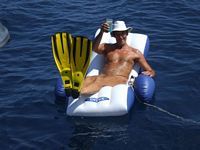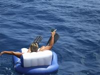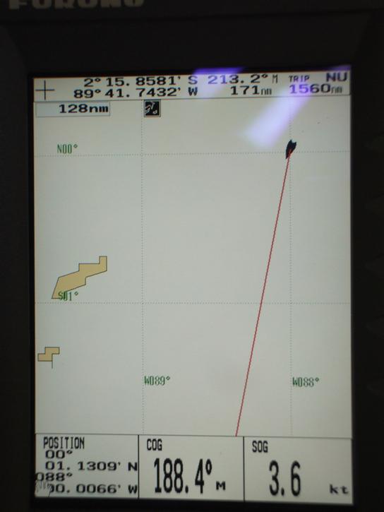 We timed crossing the equator perfectly. Michelle wanted to cross at exactly 00:00S 88:00W and also have it at 9am in time for the morning SSB Net. Like the spoiled brat that she is she got all her wishes. We dropped the sails and drifted for a few hours and generally frolicked like a pair of kids. We inflated our floating chair and tied it to the boat. We celebrated with a Savoy Springtime and of course tossed a wee dram to Neptune, the lad himself. Weīre not totally conviced he appreciated the good whiskey we gave him since there was absolutely zero wind when we finally figured it was time to get moving again. Or maybe the wind gods were put out that we didnīt give them a wee dram as well. We motored for the next 12 hours in glassy seas and not a puff of breeze. And here we thought we would have to drift to waste time. Ha! Our position at the end of Day 7 was 00.13S 088.19W with just 84nm to our destination. We should arrive in Wreck Bay, Isla San Cristobal at dusk tomorrow if all goes well.