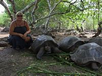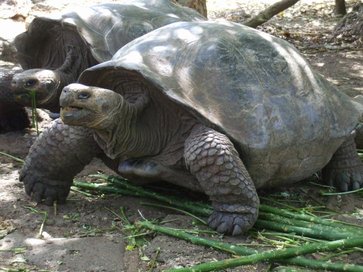 Halfway around the complex we arrived at the big guys. They were an impressive sight. We even spied a couple doing what animals do and as soon as the male finished the female raced (can you use that verb with tortoises?) off. We hung out with these guys for about 20 minutes watching them head butt and hiss at each other just like cantankerous old men. They began the breeding progam here by relocating 45 tortoises from the northern Galapaguera program. Until this area was opened, the giant tortoise of San Cristobal was only found in the 26 square kilometers at the very north end of the island. Any major change in the environment would probably see the extinction of this species. These giants will live up to 180 years. They donīt know their sex until theyīre at least 12 years of age and they finally begin breeding around 30 years. At least I think I remembered all those facts right.