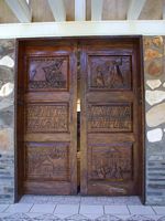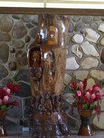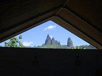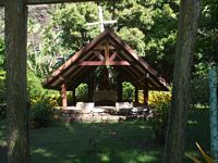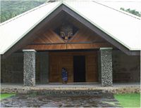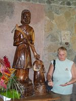 The Eglise Saint-Etienne is a modern church, built in 1981 over the site of the oldest church in the Marquesas. The architect was Frere Gerard, the same guy responsible for designing the churches weīd seen in Taiohae and Vaitahu. He had the church built from beach boulders and ornamented it with local woods. He had one feature built in to the design, a large triangular opening near the roof which framed the classic view of Oave lava plug. Itīs a wonder anyone can concentrate on the sermon with a vista like that in front of the eyes. The carvings on the main entry door are carvings by Garrick Yrondi, one panel depicting the stoning of St. Stephen. We are not sure what the others are. The pulpit inside was from a single piece of Tou and portrays the prow of Godīs ship cutting through the stormy waves of purgatory, the net of souls being gathered up. Between the fish net and the prow is an upside-down tiki head which is supposed to symbolize the denial of paganism. The base has tiki faces, tatoo designs and hellish animals scrambling in the tree roots. Altogether an amazing piece of artwork. There was one other carving which stood out, that of a wooden tabernacle with the images of Christ and the Apostles at the Last Supper carved into the base. Itīs interesting to see so much local craftmanship displayed in the churches.