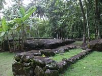 Hikokua consists of a huge central rectangular dance floor surrounded by low split-level terraces and stone platforms and tiki. Ancient Marquesans dug the entire site out of the hillside and piled up the earth behind high stone retaining walls. Artifacts discovered in various pits showed a continuous time line of use dating from around 1250AD through to the 19th century. Near the entrance were deep earth ovens. The low split-level terraces were apparently used for spectators to watch the public festivities. A large flat boulder supported by smaller rocks was used for solo dancers, and to display young chiefs and women who had received their first tatoos, indicating the entry into manhood or in the case of girls, puberty rites. At the north end of the dance floor is a large platform faced with cut slabs of the precious red tuff.