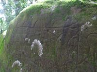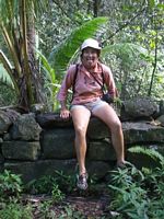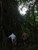 Next stop was the archeological site of the Kamuihei Ceremonial Center. The ancient village was situated near a small stream amid a forest of giant banyans, mape and candlenut trees. This was apparently normal and the existence of these giant trees have allowed archeologists to find a large number of these ancient villages with a tremendous degree of accuracy in the dense tropical overgrowth. The village center of Kamuihei consisted of two tohua, the ancient areas reserved for festivities, the meae Iipoka reserved for sacrifices and sacred doings, a large storage silo for breadfruit paste and some petroglyphs. Most villages were built around the banyan trees, and pits were carved in amongst the roots which held the tabu items that could not be touched again by mortal hands and bones of sacrificed victims. Cup like depressions that were seen in the rock back at the church are clearly evident and may have held offerings for the gods. There were pits that held victims ready to be sacrificed, and Jocelyn says they were kept in a dazed state from some barbituate substance. She went on to fill our heads with various facts and figures none of which we can recall with any sort of accuracy which would allow us to repeat it on a public domain website.