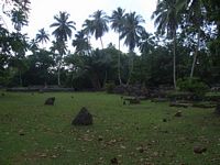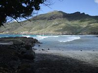 After Xavierīs morning lap around the anchorage this morning we piled into his tiny car and headed up out of the village of Hakahua. Not far outside the village the road become a rutted dirt track which required patience to negotiate. Our destination today was Hakamoui, not Anahoa as we previously thought. According to Xavier, Hakamoui was known as the valley of the Kings when Chief Heato and his tribe occupied this area during the last century. His Paepae Menaha was here which became a meae after his death. Unfortunately it hasnīt been restored and is buried deep in the overgrowth. The beach is a favorite hangout with the locals and a good surf beach. Definitely not an anchorage for Warrior. On a calm day such as it was the beach was breaking heavily. Not many people live in the valley now and it looks a bit forsaken with only a few horses grazing near the stoney beach along the bay. We gathered wood for the BBQ and Xavier took charge, preparing lamb chops and sausages with secret french herbs and spices.