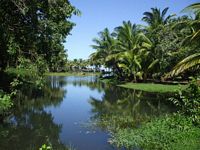 Bright and early this morning we were off to hike to beautiful Ahuei Waterfall, officially named Vaipo Cascade. Often throughout French Polynesia there will two names, one in the local polynesian dialect and the other in French. Occasionally there will be a third in English. Makes for some nice confusion and very cluttered maps. We tethered the dinghy and made our way through the small, extremely tidy village of Hakaui, situated around a brackish lagoon. There was an overwhelming abundance of guava, mango, banana, pampalmousse, breadfruit and lime trees. Oh and mega coconuts. Every garden was carefully tended, not a leaf out of place, and there was even a small chapel.