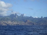 A Friday departure. Amazing how many cruisers will not depart on a Friday because they think itīs bad luck. We had a slow start, being in the wind shadow of Ua Pou for the first eight miles but after finally clearing the island the wind picked up and we sailed gently along. The seas were slight to moderate, the winds enough to keep us steady, overall very pleasant. As we left the anchorage this morning we were accompanied by a school of dolphins but they soon lost interest in us. We wondered if they were the electric dolphins which frequent this area. If you touch them you can apparently get a shock off them. We have heard about them but never seen any and they didnīt look any different to any other dolphin so we will never know. This afternoon we caught a very decent sized yellow fin tuna so it was fresh sashimi for dinner tonight. What a treat after so long without fish. This dang Ciguaterra is a real problem throughout French Polynesia and is preventing us from fishing from the anchorages.