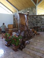 We took in the new local church which again showcased local carvings depicting Marquesan interpretations of biblical scenes. We particularly enjoyed a very polynesian baby Jesus holding a breadfruit and Josephīs woodcarving Marquesan tool. The red volanic stone, keetu, used in the plaque was originally used to carve tiki and often reserved only for village chiefs and dignitaries as it was considered very precious.