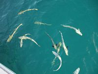There is a large colony of shark suckers under our boat again. Michelle had tossed a bit of left over breakfast overboard and suddenly there was a feeding frenzy. So she grabbed the camera and a bit more bread and tormented the poor creatures until she got a few good photos. The suction cup on their heads really stood out this morning in the clear water.