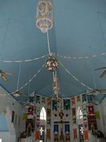 We headed ashore around 9am expecting to have to check in with the gendarme and there was no gendarme here so the official checkin to the Tuamotus waits till we arrive at another atoll. We took the dinghy ashore just opposite the church and of course couldnīt resist taking a peak inside. It was constructed of blocks of coral sealed with coral limestone. The ornamentation was very colorful with pennants and chandeliers made of coral and shells, very different from the Marquesan churches filled with wood carvings.